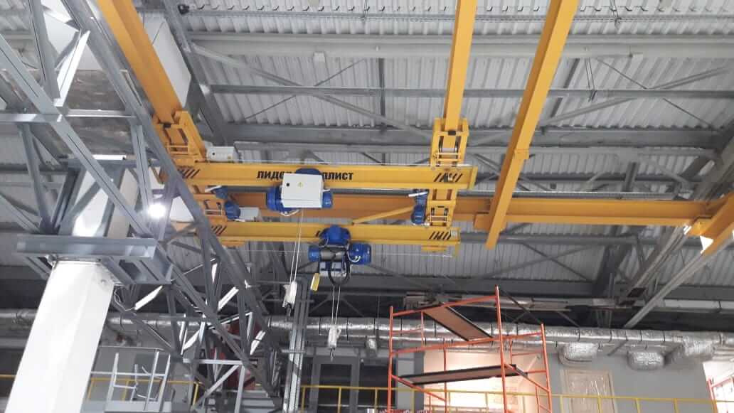 - Подвесные мостовые краны — незаменимы для ограниченных и высоких помещений, например, в складах или на небольших производствах. Их преимущества — экономия пространства и эффективное использование всей площади.